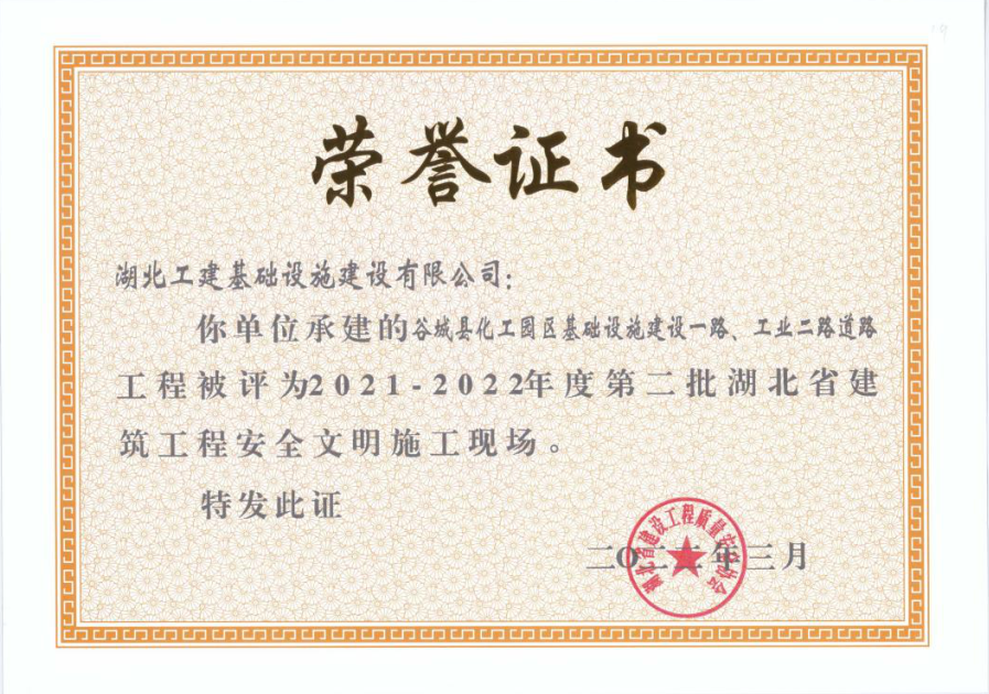 谷城縣化工園區基礎設施建設一路、工業二路道路工程被評為2021-2022年度第二批湖北省建筑工程安全文明施工現場
